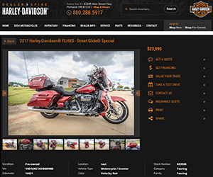 Designed explicitly for Harley-Davidson® dealers, Dealer Spike’s custom showroom includes mobile-responsive drop-down navigation that categorizes the bikes by family, make, and model. The H-D® digital showroom will be updated automatically, so dealers need not worry that their digital showroom is outdated.